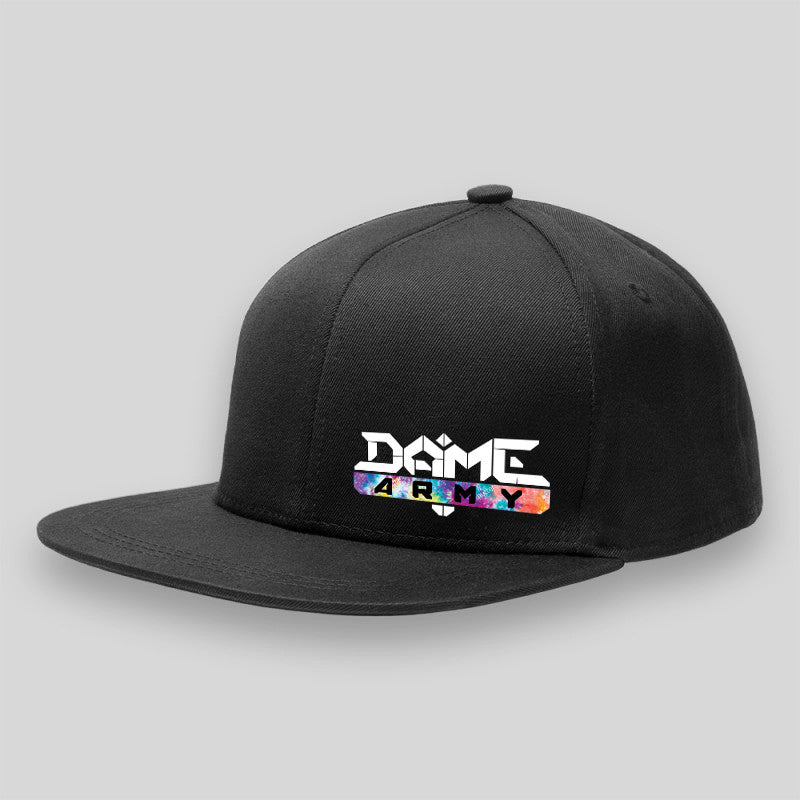 Schwarzes Snapback Cap mit bedrucktem "Dame Army" Logo bunt